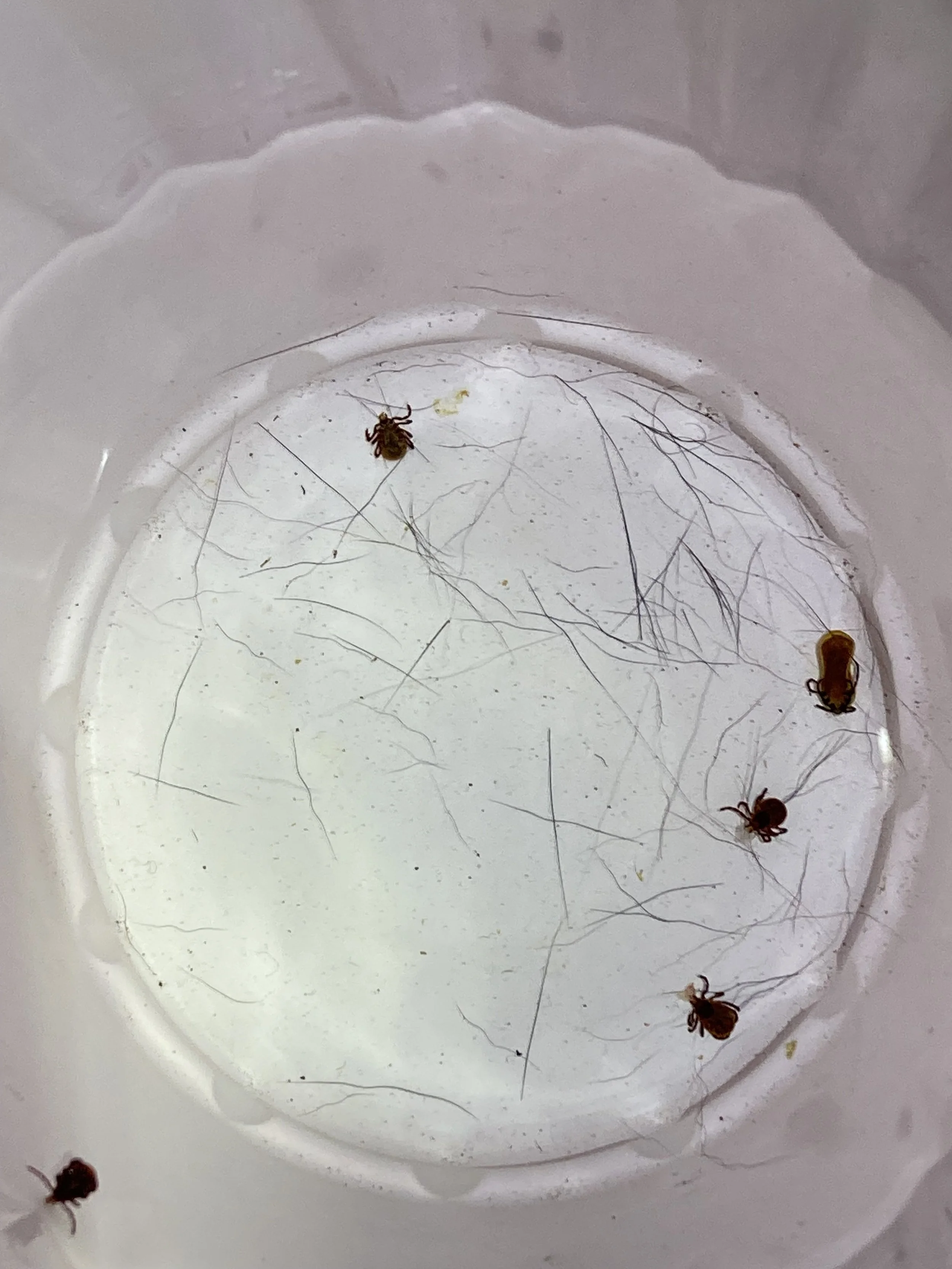 If unprotected, if he brushed up against a small plant he would have a least one tick on him. This was a big challenge since he walked off-leash each morning amongst brushes, trees, tall grasses, etc… I avoided using any chemical preventatives to control fleas and ticks. I’ve opted for safe, nontoxic alternatives so far. (Spoiler alert: the less toxic approach is a success!) After each outing/adventure I would brush him thoroughly with a flea/tick comb from head to tail. I would also run my fingers through his coat against the bias several times and also check his ears and between his toes. If I felt the slightest bump while brushing him or running my fingers through his coat I stop and look to see if it is a tick. It usually was! They can be as small as a tomato seed! I recheck him a couple hours later to be sure none got by the first check.