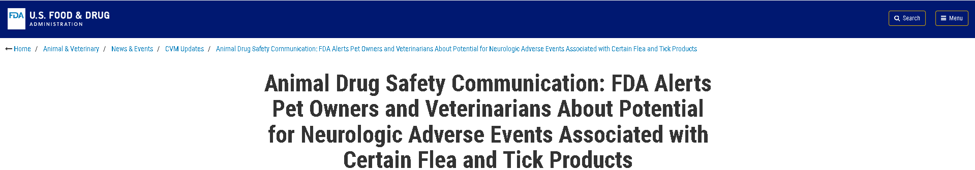 “The U.S. Food and Drug Administration is alerting pet owners and veterinarians to be aware of the potential for neurologic adverse events in dogs and cats when treated with drugs that are in the isoxazoline class.